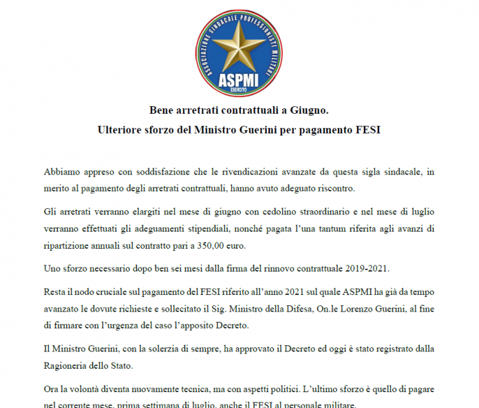 Resta il nodo cruciale sul pagamento del FESI riferito all’anno 2021 sul quale ASPMI ha già da tempo avanzato le dovute richieste e sollecitato il Sig. Ministro della Difesa, On.le Lorenzo Guerini, al fine di firmare con l’urgenza del caso l’apposito Decreto.