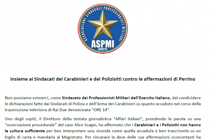 Uno degli ospiti, il Direttore della testata giornalistica “Affari Italiani”, prendendo la parola su una “osservazione procedurale” del caso Alice Scagni, ha affermato che i Carabinieri e i Poliziotti non hanno la cultura sufficiente per ben interpretare una vicenda come quella accaduta e ben trascriverla su un foglio di carta e mandarla al Magistrato. Per rincarare la dose delle sue affermazioni sconcertanti ha aggiunto: chiunque abbia fatto una denuncia sa che i poliziotti e i carabinieri che sono amici dei giornalisti scrivano ancora con un dito.