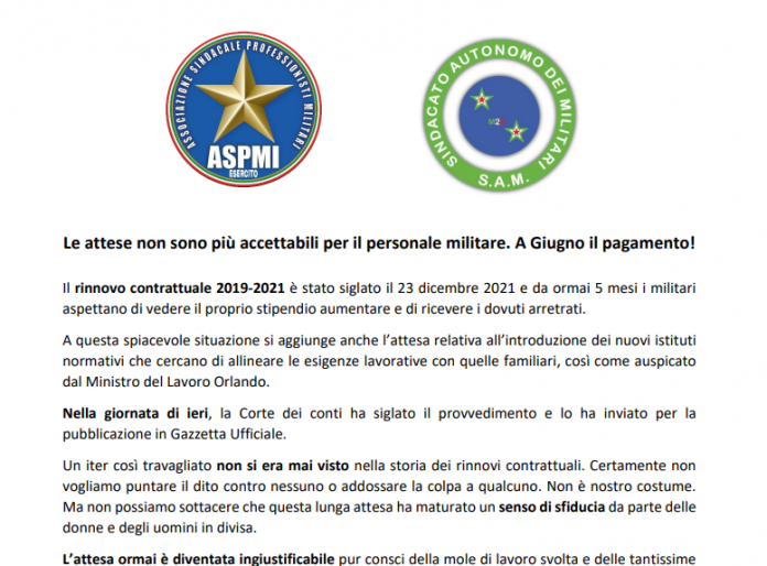 Il rinnovo contrattuale 2019-2021 è stato siglato il 23 dicembre 2021 e da ormai 5 mesi i militari aspettano di vedere il proprio stipendio aumentare e di ricevere i dovuti arretrati.