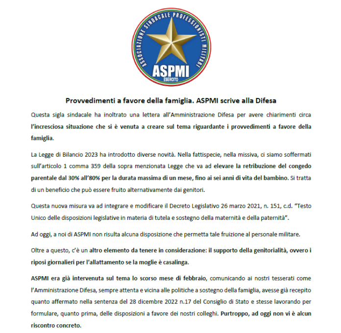 ASPMI era già intervenuta sul tema lo scorso mese di febbraio, comunicando ai nostri tesserati come l’Amministrazione Difesa, sempre attenta e vicina alle politiche a sostegno della famiglia, avesse già recepito quanto affermato nella sentenza del 28 dicembre 2022 n.17 del Consiglio di Stato e stesse lavorando per formulare, quanto prima, delle disposizioni a favore dei nostri colleghi. Purtroppo, ad oggi non vi è alcun riscontro concreto.