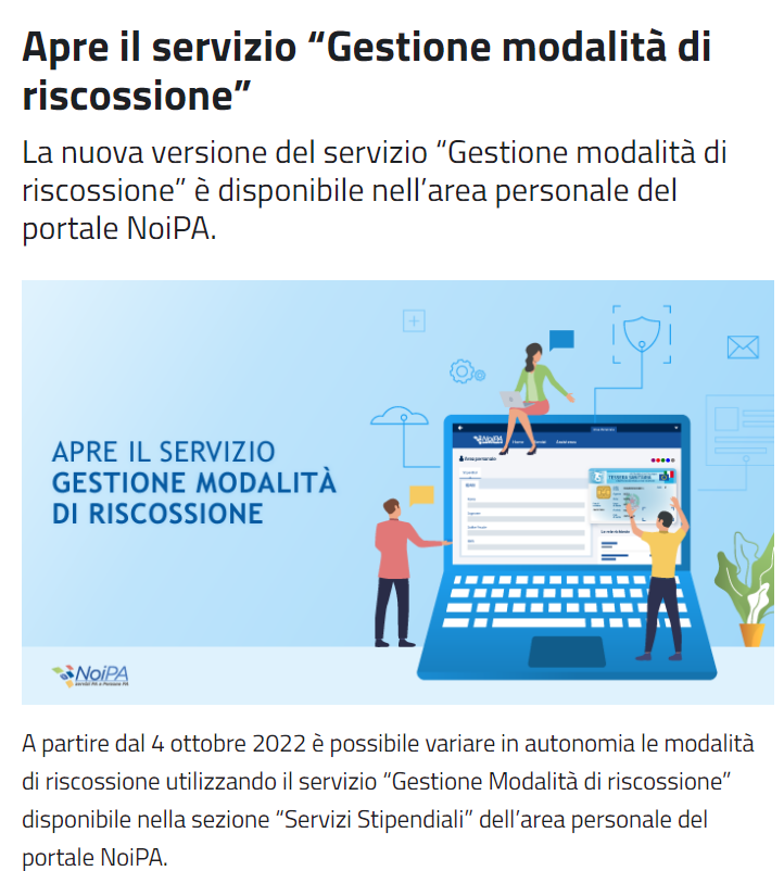 Con news del 5 ottobre 2022, NOIPA informa gli utenti che la funzione “gestione modalità di riscossione” presente nell’area self service “Servizi Stipendiali” del proprio profilo utenza è stata riattivata. Pertanto, a partire dal 4 ottobre 2022, sarà possibile nuovamente variare in autonomia la modalità di riscossione degli stipendi mensili da percepire ogni qualvolta ci sia la necessità di inserire nuove coordinate IBAN del conto corrente.